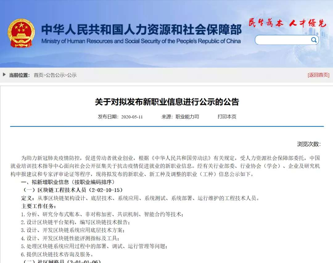 公告由人社部职业能力司提供。公告称:“为助力新冠肺炎疫情防控,促进劳动者就业创业,根据《中华人民共和国劳动法》有关规定,受人力资源社会保障部委托,中国就业培训技术指导中心面向社会公开征集关于抗击疫情促进就业的新职业信息。经有关行业部委、行业协会(学会)、企业及研究机构申报建议和专家评审论证等程序,现将拟发布的新职业、新工种及调整的职业(工种)信息公示如下。”